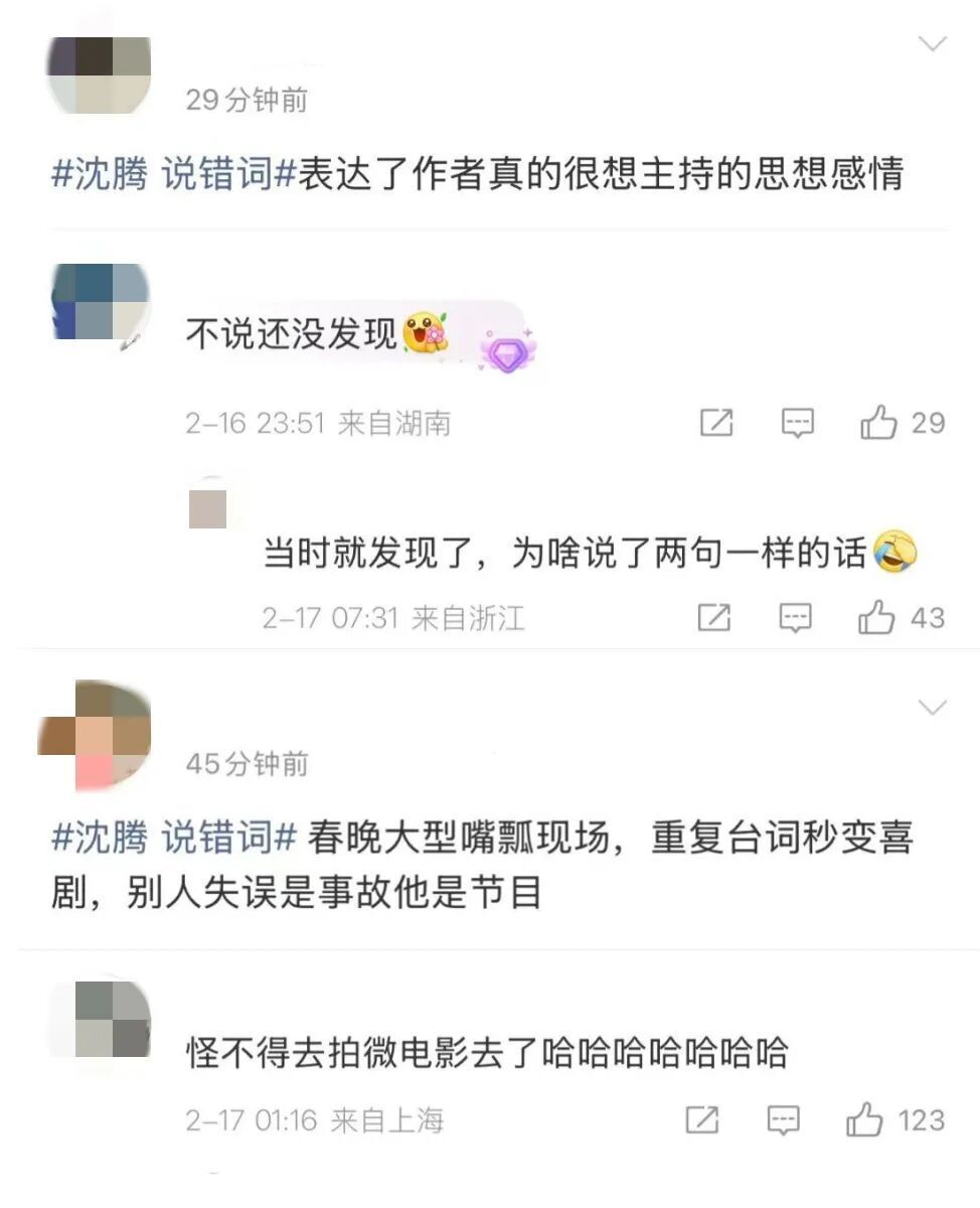 有网友调侃,“怪不得拍微电影去了”“别人忘词是事故,沈腾忘词是节目”。